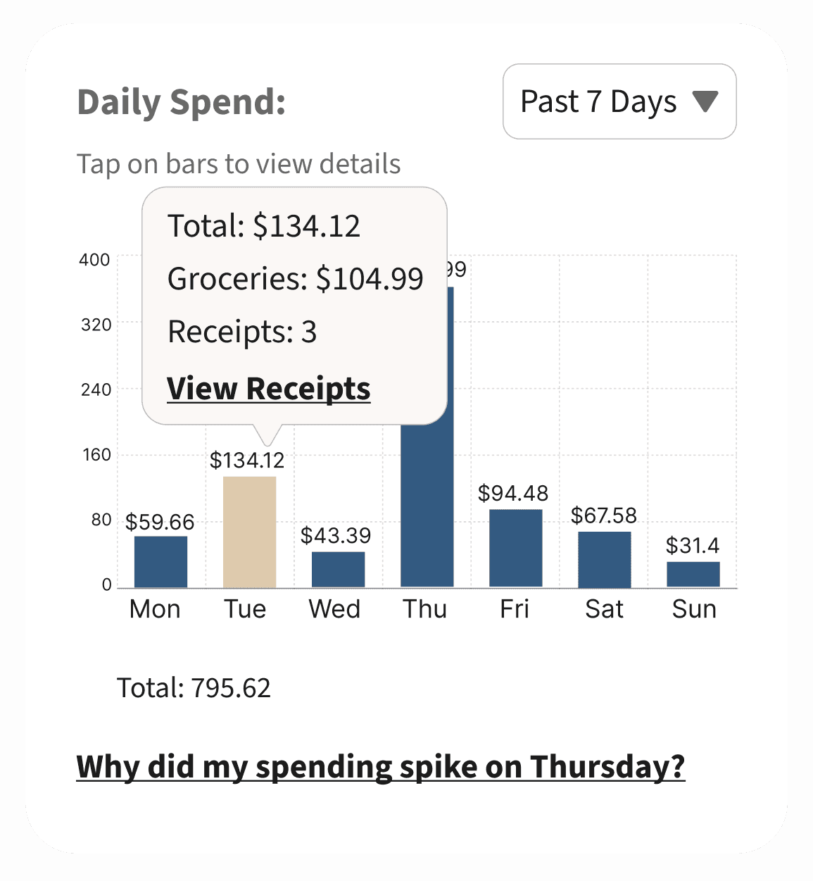 Snap a photo or upload any receipt or bill — we extract and categorize the spending for you instantly.