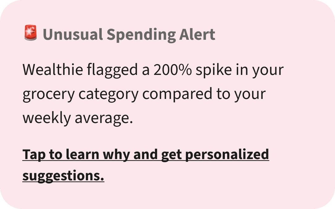 Our AI engine delivers real-time tips, flags spending spikes, keeps you on track and 24/7 help from Wealthie, the chatbot.